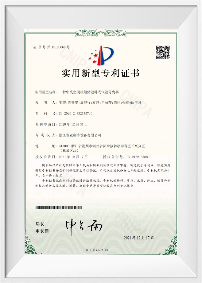 A utility model of a liquid storage horizontal gas-liquid separator for a central air-conditioning unit