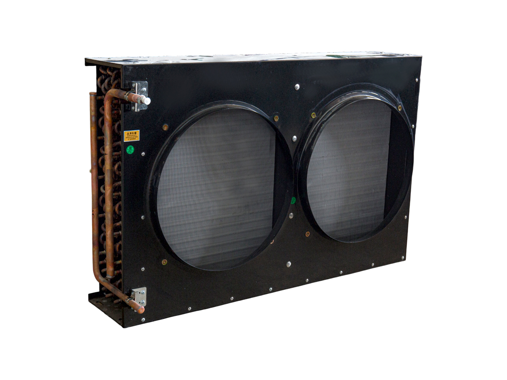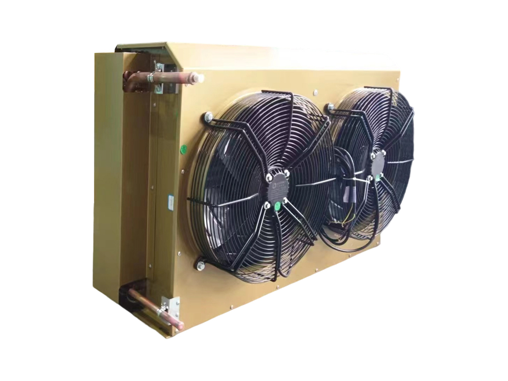 The double-plate H-shaped condenser features a parallel flow structure, with multiple sets of flat tubes and manifolds forming the heat exchange unit. Dual-sided reinforced fins enhance airflow. This structure increases the effective heat exchange area per unit volume, improving heat exchange efficiency between the medium and air. The equipment is typically constructed of aluminum alloy, balancing thermal conductivity and structural strength. The fan system utilizes an external rotor motor-driven axial fan, achieving low noise operation and high air volume output, making it suitable for medium and high-temperature cooling conditions. The overall compact structure facilitates system integration and maintenance.